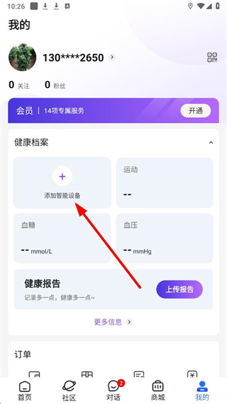 2、进入个人中心后,点击添加智能设备选项,进入设备添加页面。