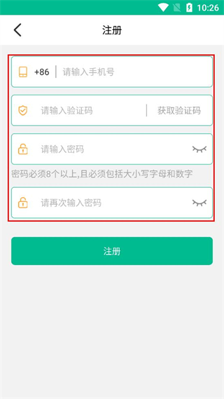 3、进入注册页面,依次填写手机号,点击获取验证码并填写,再设置符合要求的密码。