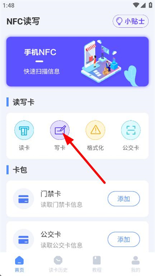 1、打开NFC工具,在主界面的读写卡区域点击写卡选项。