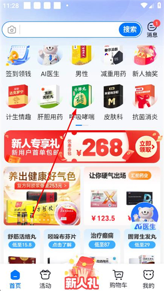 1、打开方舟健客网上药店APP,在首页找到目标药品分类并点击进入。