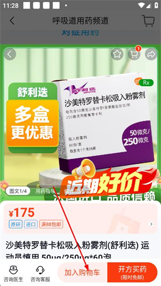 3、在药品详情页,点击加入购物车按钮完成操作。