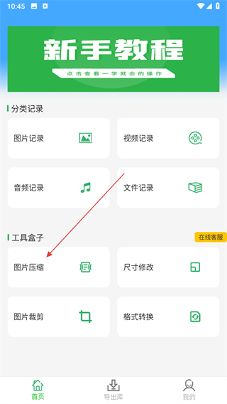 1、打开聊天记录恢复大师应用,在首页工具盒子中找到图片压缩选项并点击。