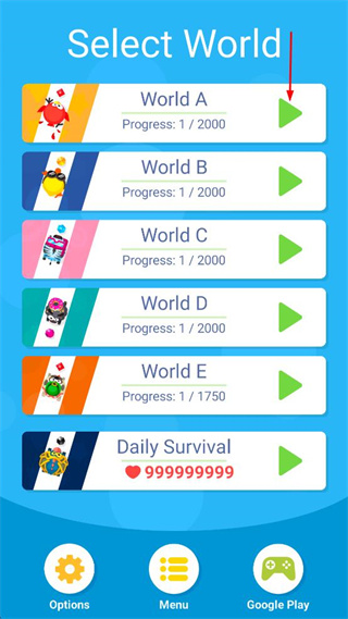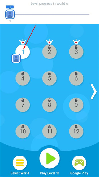 1、在世界选择界面点击WorldA对应的按钮,进入该世界的关卡选择界面。