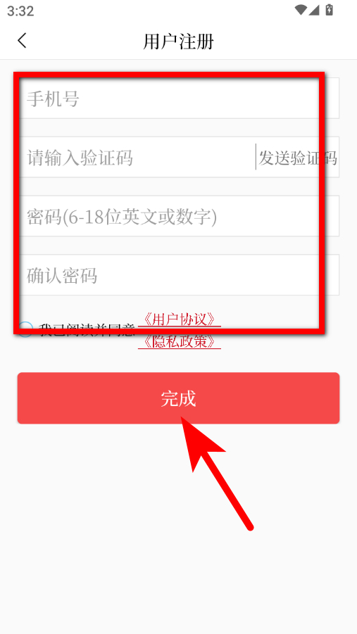 4、输入信息,勾选协议后点击完成按钮,即可完成账号注册操作。