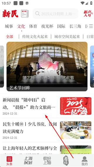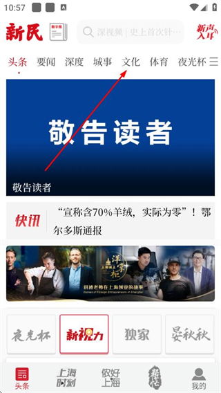 1、打开新民晚报APP,点击上方文化栏目,进入文化新闻页面。