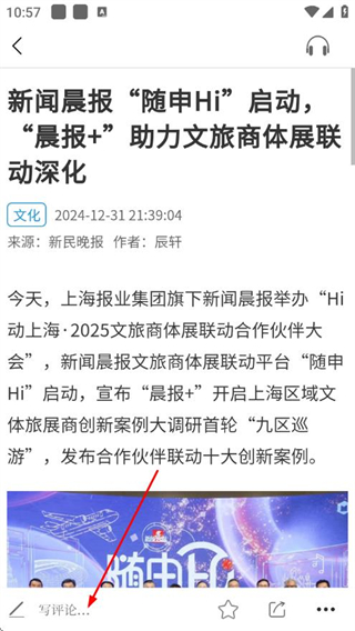 3、在新闻详情页底部,点击写评论...输入框,即可输入评论内容进行评论。