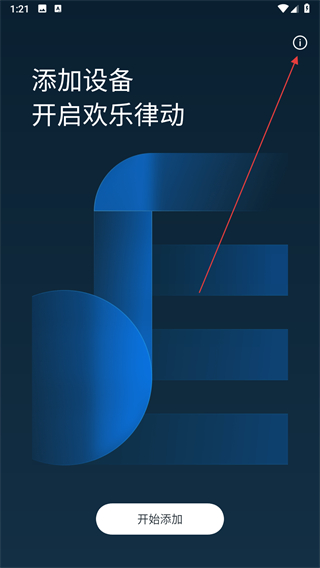 1、打开欢律APP,在添加设备页面点击右上角的i图标,进入关于页面。