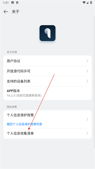 2、在关于页面中找到个人信息收集清单选项,点击进入对应的信息列表页面。
