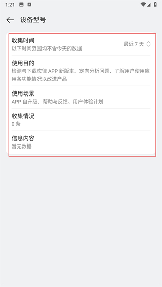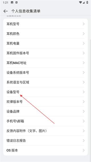 3、在个人信息收集清单里找到设备型号选项,点击后进入设备型号的详情页面。