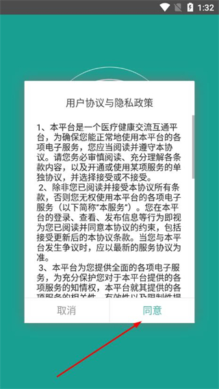 1、打开网上协和app的登录页面,在弹出的用户协议与隐私政策窗口中点击同意,完成账号注册并登录。