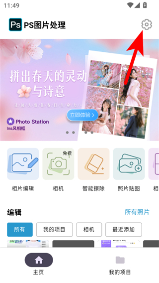 1、打开PS图片处理APP,点击页面右上角的设置图标,进入我的页面。