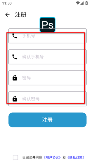 4、在注册页面依次填写手机号、确认手机号、密码、确认密码,勾选同意协议后点击注册按钮,即可完成账号注册。