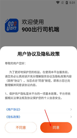 1、打开900出行司机端,阅读用户协议及隐私政策内容,确认后点击同意按钮。