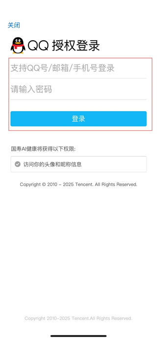 3、在QQ授权页面填写账号密码,完成授权后即可登录国寿AI健康账号。