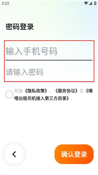 3、在密码登录界面,依次填写手机号码和对应的登录密码信息。