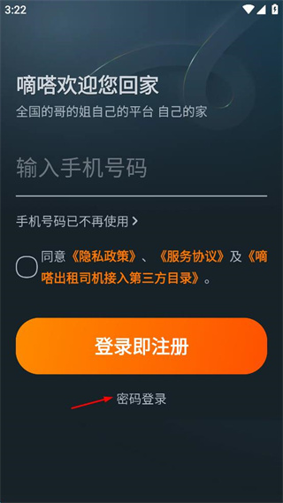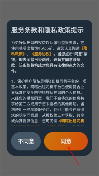 1、打开嘀嗒出租司机端,查看服务条款和隐私政策提示,点击界面中的同意按钮。