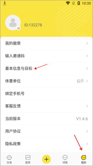 1、打开闪电减肥饮食记录APP,点击底部我的选项,进入个人页面后选择基本信息与目标。