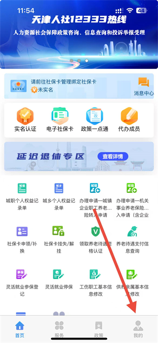 1、打开天津人力社保app,点击右下角我的选项,进入个人页面。