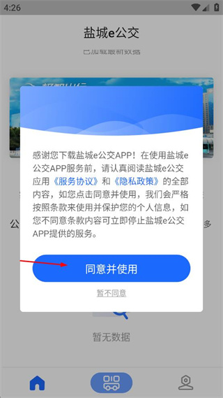 1、打开盐城e公交APP,查看弹出的服务协议和隐私政策,点击同意并使用按钮进入主界面。