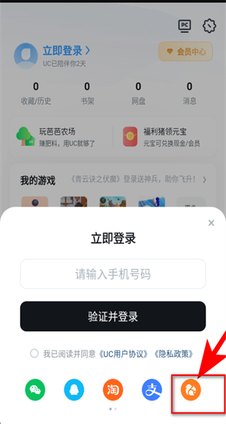 3、在登录弹窗里,点击UC图标,进入账号密码登录的页面。