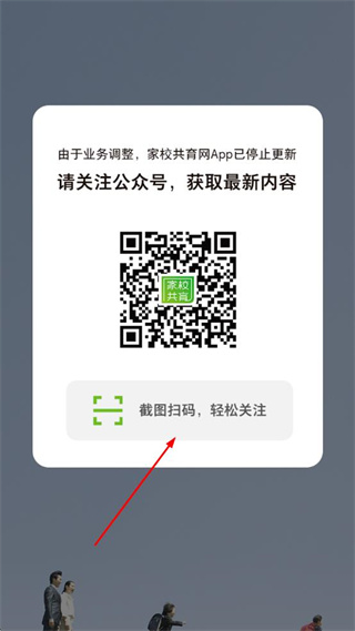 3、看到业务调整提示弹窗,点击截图扫码轻松关注按钮,准备扫码关注公众号获取内容。