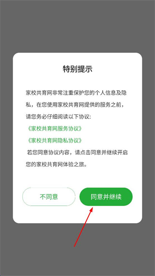 1、打开家校共育网APP,查看弹出的特别提示弹窗,点击同意并继续按钮进入应用。