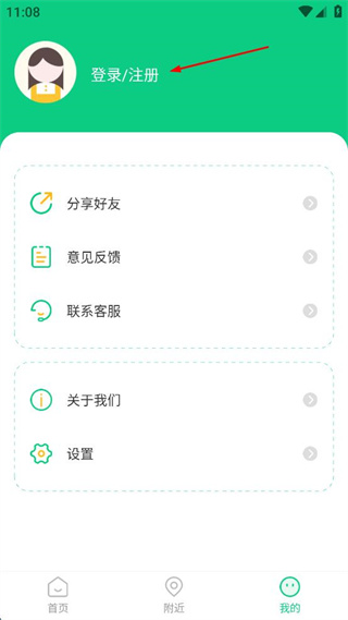 3、在我的页面中,找到上方的登录/注册区域,点击该区域可进行账号的登录或注册。
