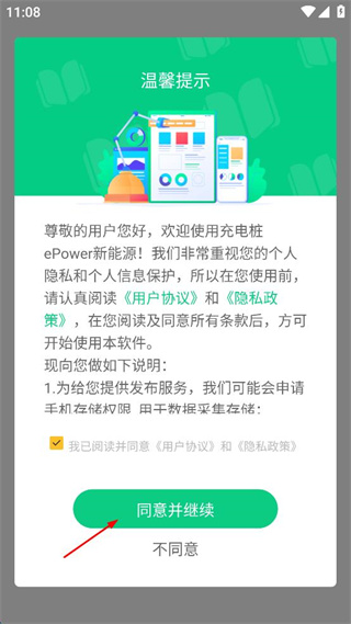 1、打开充电桩ePower软件,看到温馨提示弹窗,勾选同意协议后点击同意并继续按钮。