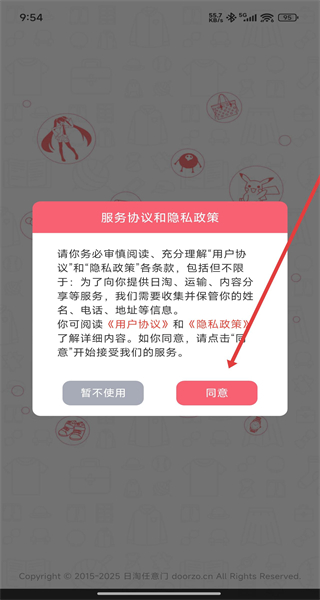 1、点击“服务协议和隐私政策”弹窗的“同意”,进入日淘任意门APP主界面。