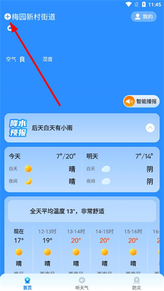 1、打开新途天气app,在首页找到顶部的城市名称区域并点击,进入城市管理页面。