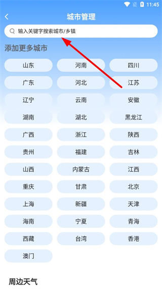 3、可通过顶部搜索框查找目标城市,也能选择省份对应的城市,选中城市后,即可完成该城市的添加。