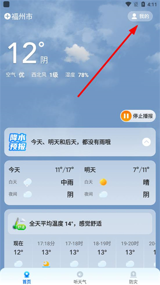 1、进入新途天气app,点击右上角我的选项,进入个人相关页面。