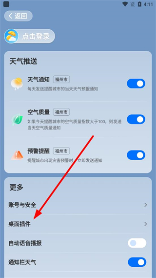 2、在该页面中,找到桌面插件选项并点击,跳转至桌面小插件设置界面。