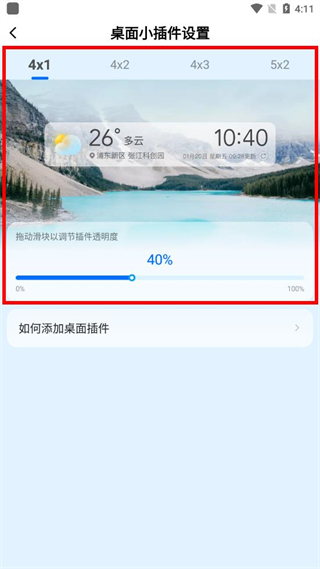 3、在桌面小插件设置页面,按个人需求设置插件的大小和透明度。