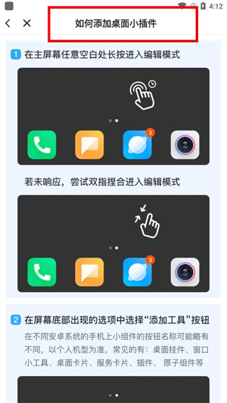 4、按照步骤说明,在手机主屏幕进入编辑模式,选择添加工具,找到插件添加至桌面,完成设置。