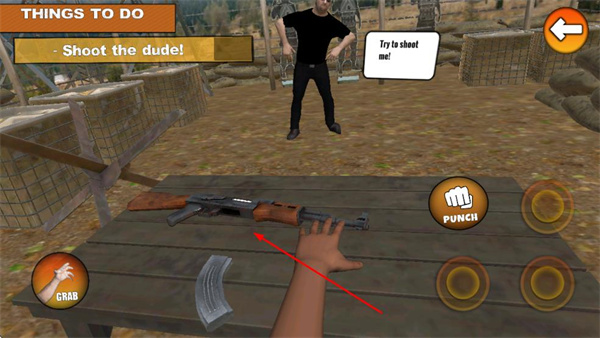 3、在射击场景中操作手部互动,拿起桌上的枪械,准备完成射击任务。