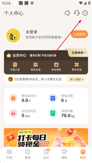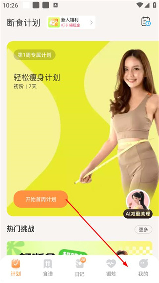 1、打开怪瘦轻断食app的计划页面,点击底部我的选项,进入个人中心页面。