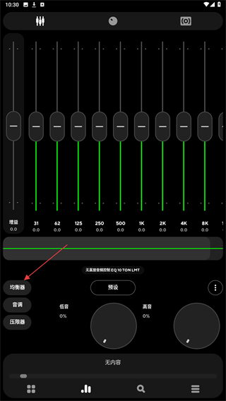 3、在均衡器界面下方,可通过低音、高音的圆形旋钮,快速调整整体强度比例。