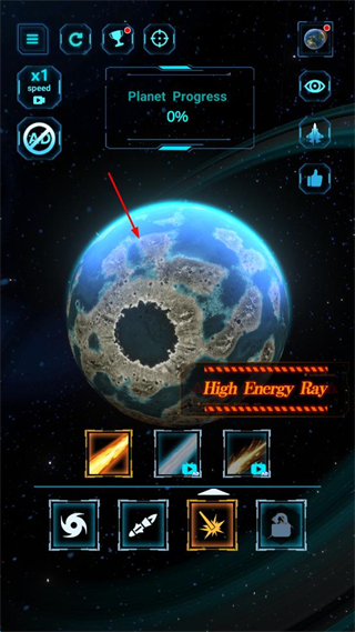 2、在星球界面选择对应的高能射线道具,准备对星球进行改造操作。