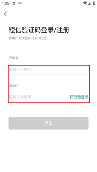 3、进入登录/注册页面,输入手机号,点击“获取验证码”并输入验证码。