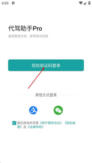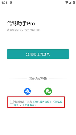 1、打开代驾助手Pro APP,勾选同意用户服务协议、隐私政策及法律声明。
