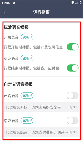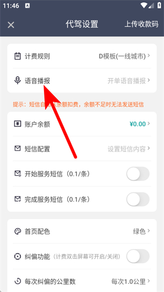 2、在代驾设置页面中,我们需要点击语音播报的选项。