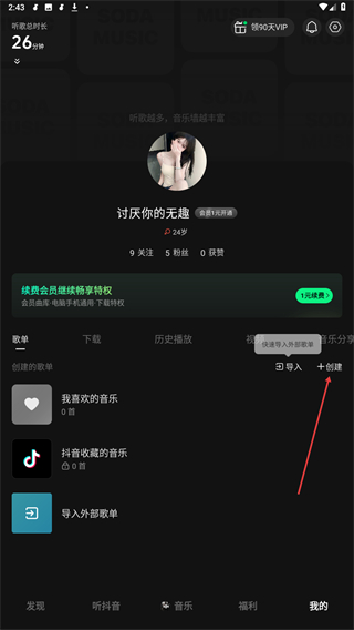 2、进入我的界面内,在歌单下点击+创建的功能按钮。