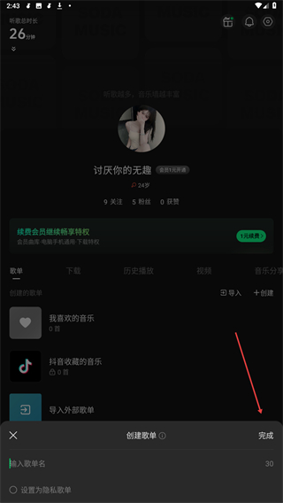 3、输入歌单名称后,点击完成的按钮即可创建成功。