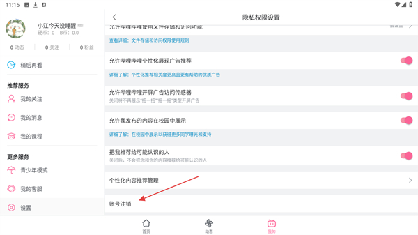 4、在隐私权限设置页面中,找到账号注销选项并点击,即可成功。