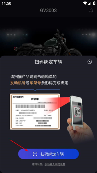 4、在主界面点击绑定车辆按钮,进入扫码绑定车辆页面准备完成车辆绑定操作。