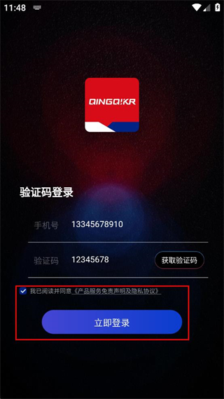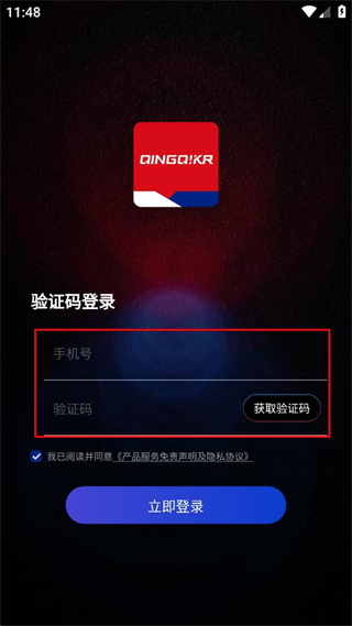 1、进入QINGQIKR软件验证码登录页面,在手机号输入框填写个人常用号码。