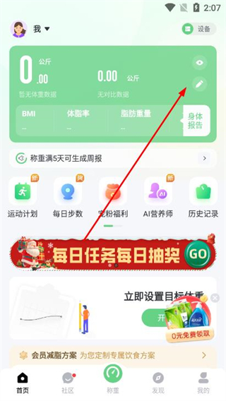 1、打开Sunri体脂秤对应的APP,点击体重数据区域的编辑图标,进入记录体重页面。