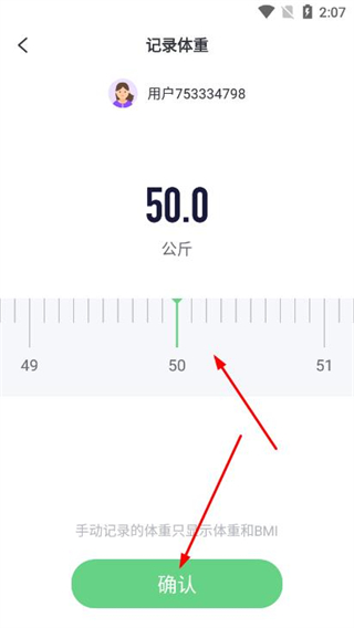 2、在记录体重页面调整体重数值,点击确认完成体重记录。