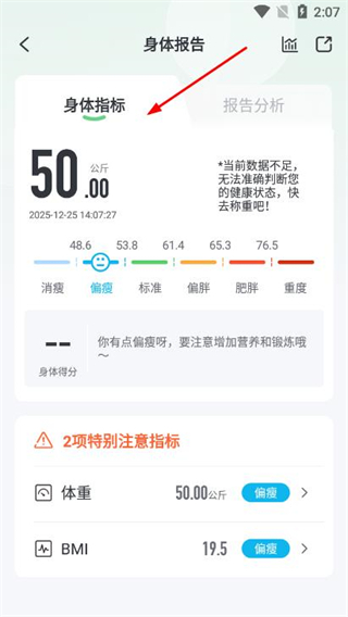 3、记录后可进入身体报告页面,查看体重、BMI等身体指标分析。